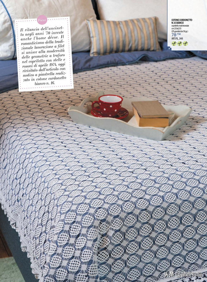 这款手工钩针编织的白色床罩,以 16 号白色棉绳,用 0.75 号钩针打造。采用菱形等几何钩针花样,结合长方形规整版型,呈现复古浪漫风格。工艺精致,白色纯净百搭