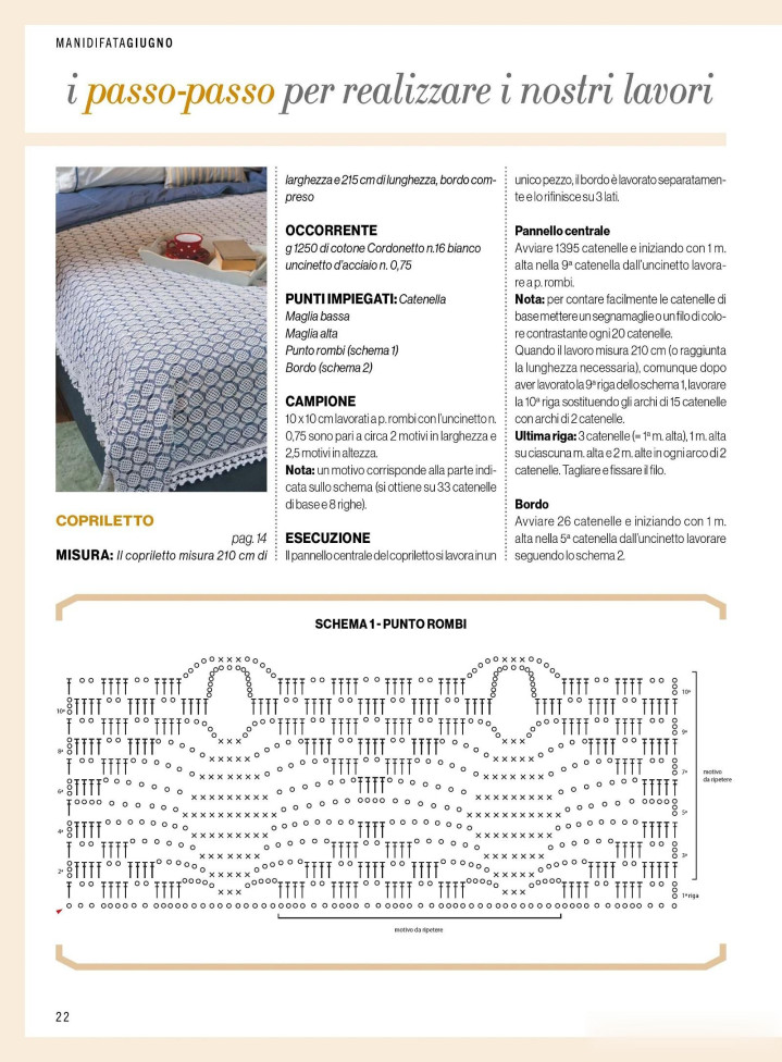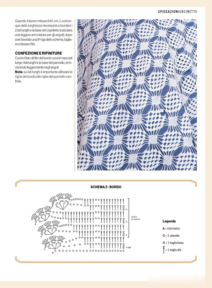 :起 1395 个链针,从菱形图案开始钩织。为方便计数,可在基础链针上用彩色线做记号扣。当钩织到 210 厘米(所需长度)时,继续按花样图钩织第 9 行,然后按第 10 行,在 15 个链针的拱门上悬挂。最后一行:3 个链针(= 高针)、1 个高针,之后在每个拱门上悬挂 2 个链针和 2 个高针,重复。剪断并固定线。